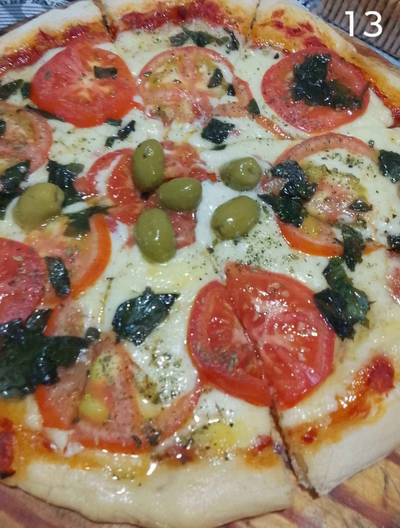Pizza napolitana con tomate, ajo, aceitunas y abundante orégano.